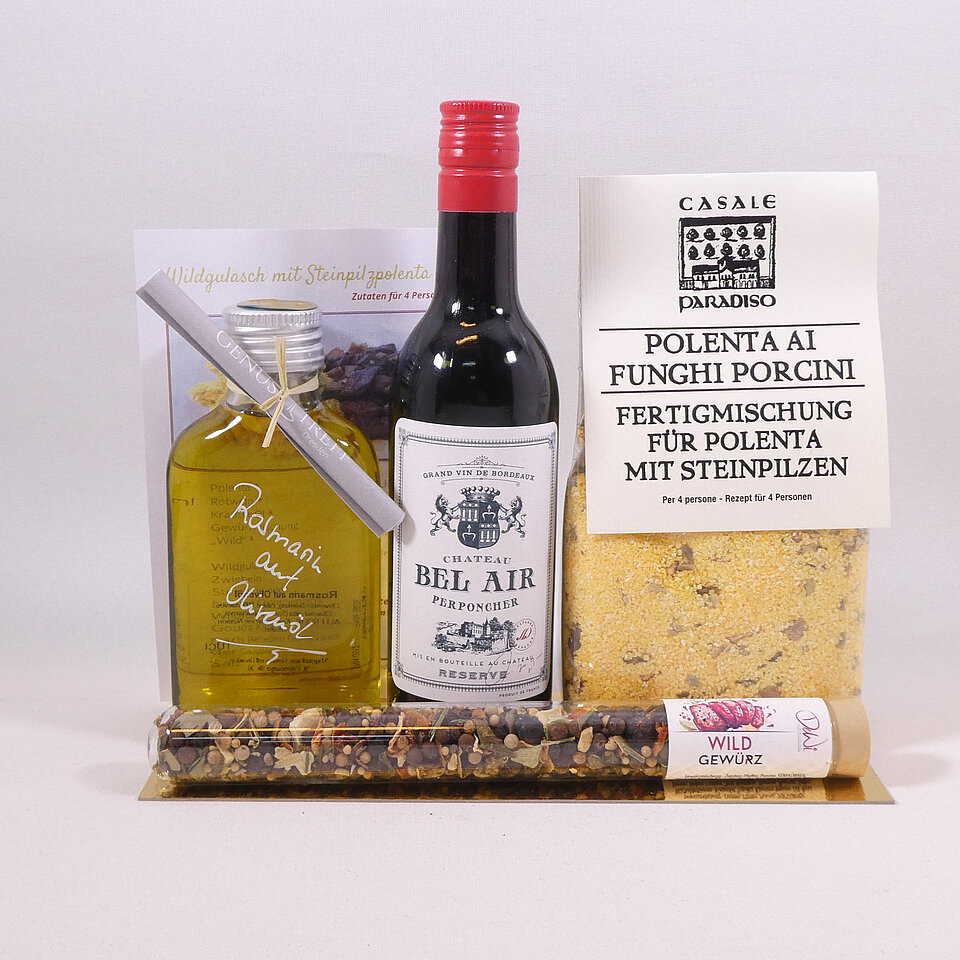 GeschenkIdee "Wildgulasch mit Steinpilzpolenta" - mit Rezept – in Folie verpackt