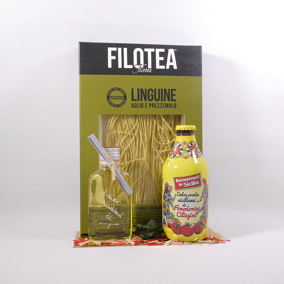 - 1 Packung Linguine Aglio e Prezzemolo (Pasta mit Knoblauch und Basilikum)