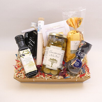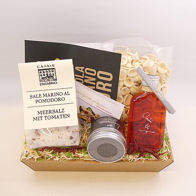 GeschenkIdee "Nationalgericht Apulien" - mit Rezept – im Präsentkorb mit Folie verpackt