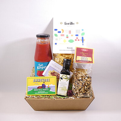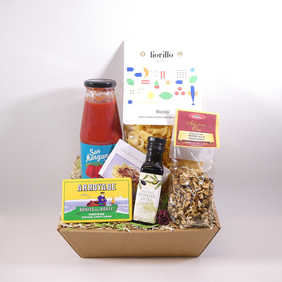 GeschenkIdee "Pasta Boscaiola mit Thunfisch" | mit Rezept – im Präsentkorb mit Folie verpackt