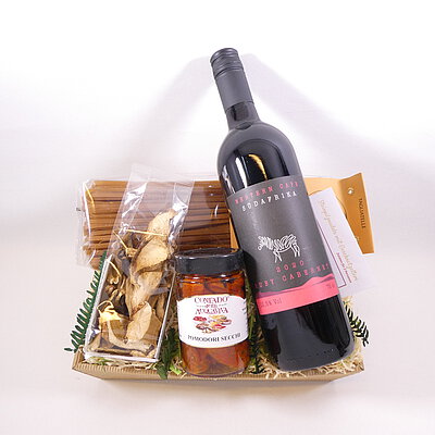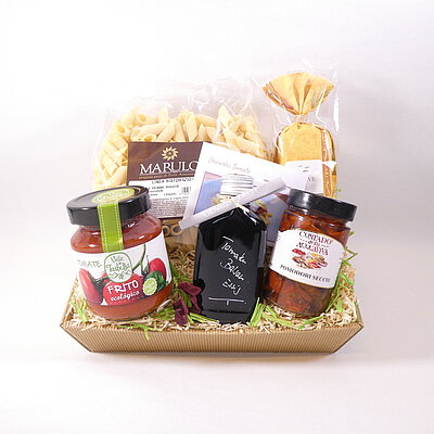 GeschenkIdee "Pasta mit Dreierlei Tomate" - mit Rezept – im Präsentkorb mit Folie verpackt