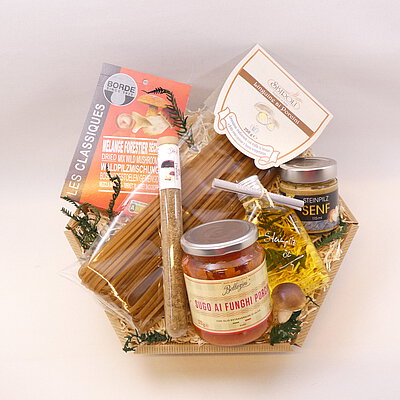 GeschenkIdee "Pilziges" – im Präsentkorb mit Folie verpackt