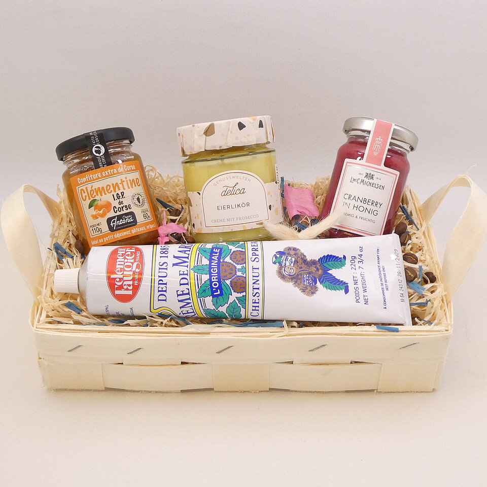 GeschenkIdee "Süßes Frühstück" – im Präsentkorb mit Folie verpackt
