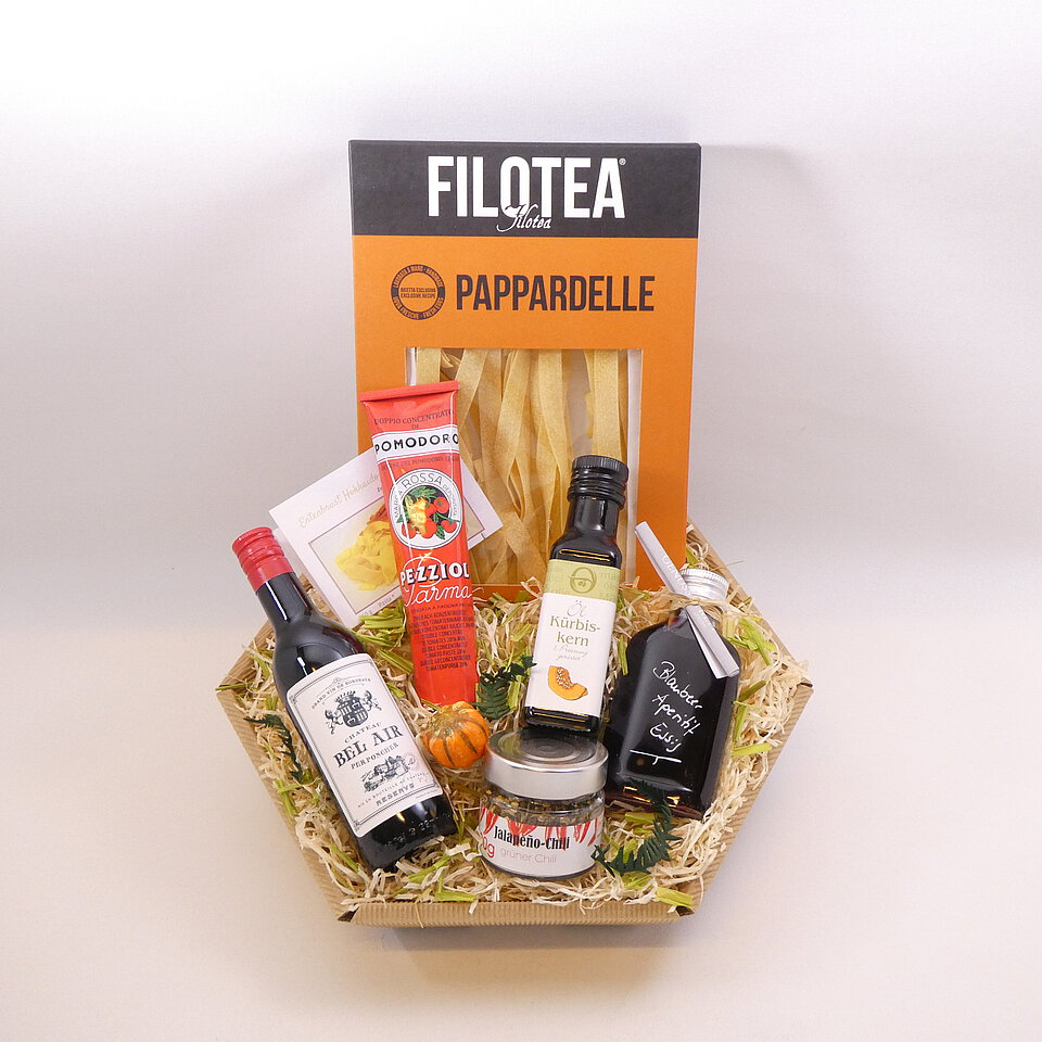 GeschenkIdee "Gefüllte Hütchen Pasta & Wein" - mit Rezept – im Präsentkorb mit Folie verpackt