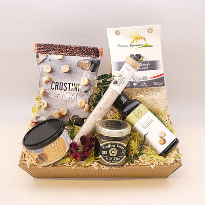 GeschenkIdee "Trüffel-Fan" – im Präsentkorb mit Folie verpackt