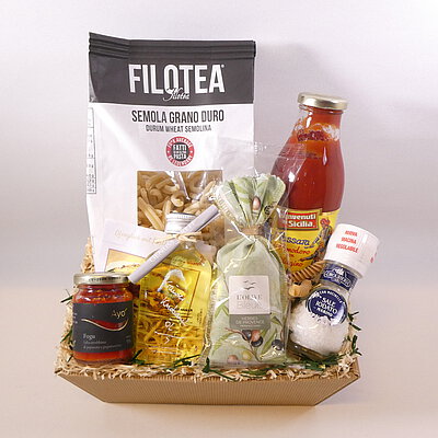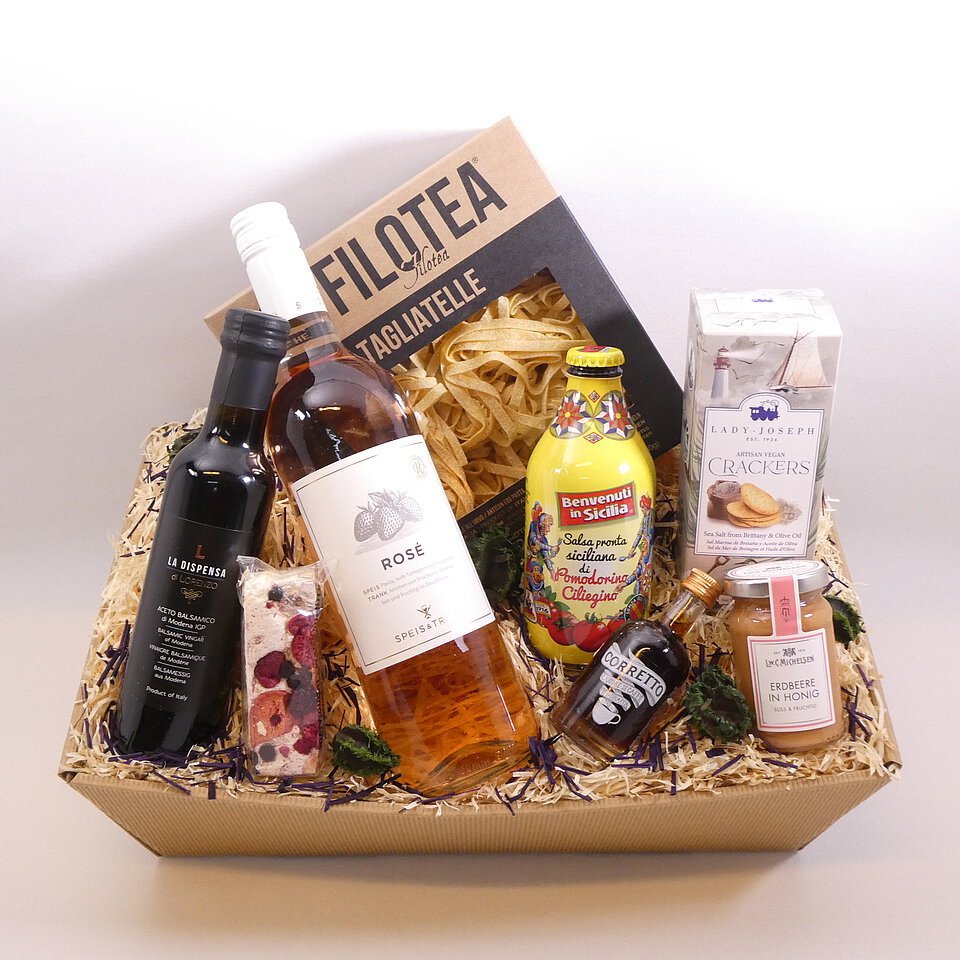 GeschenkIdee "Pasta Bolognese leicht gemacht" - mit Rezept – im Präsentkorb mit Folie verpackt