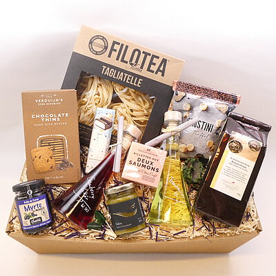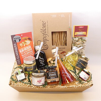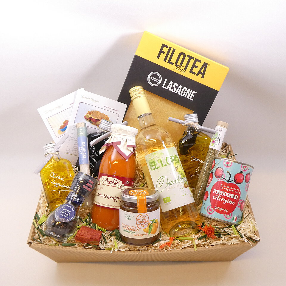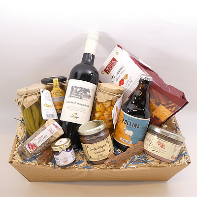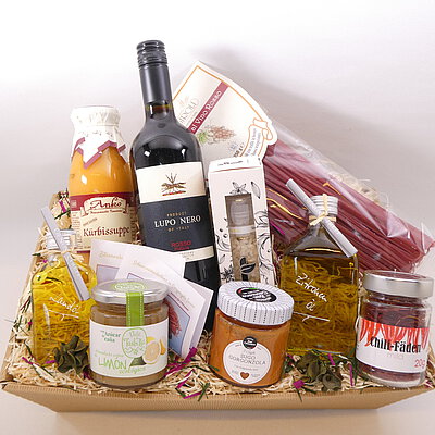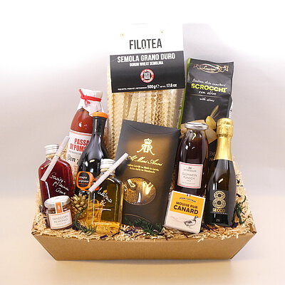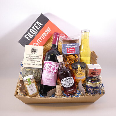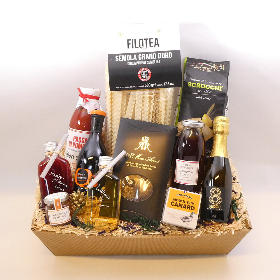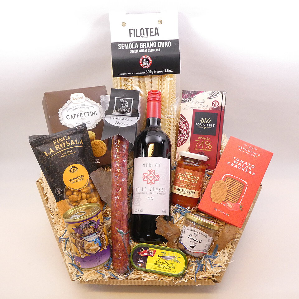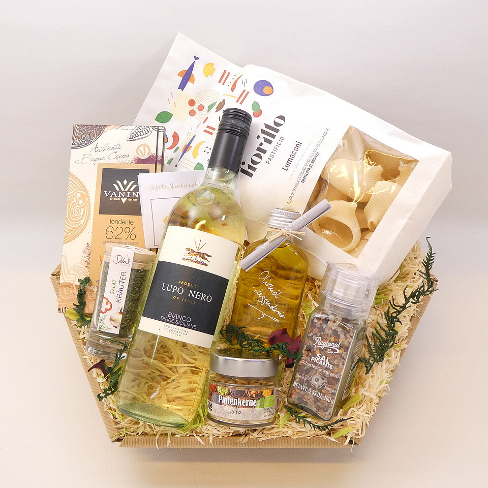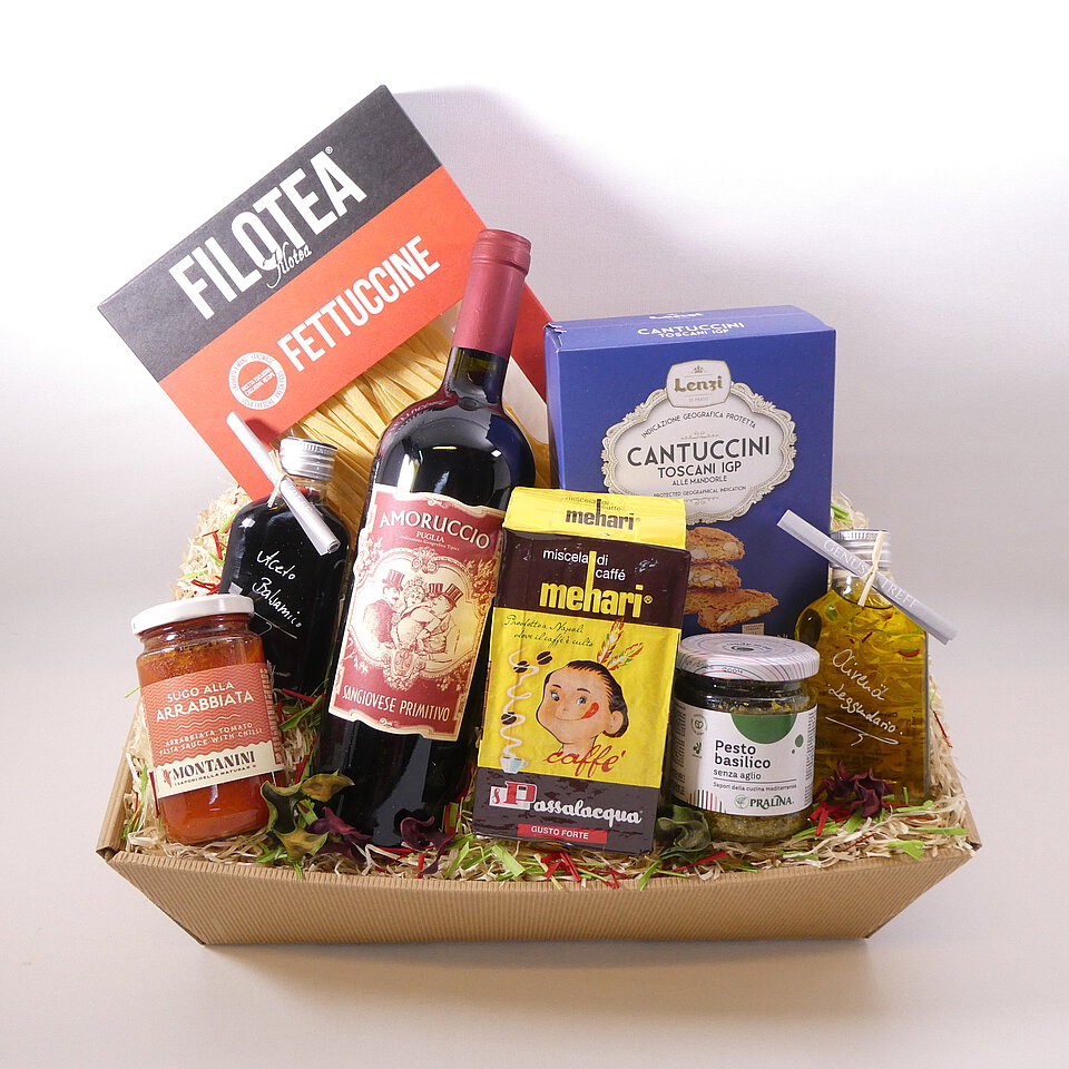 GeschenkIdee "Italienischer Genuss" – im Präsentkorb mit Folie verpackt