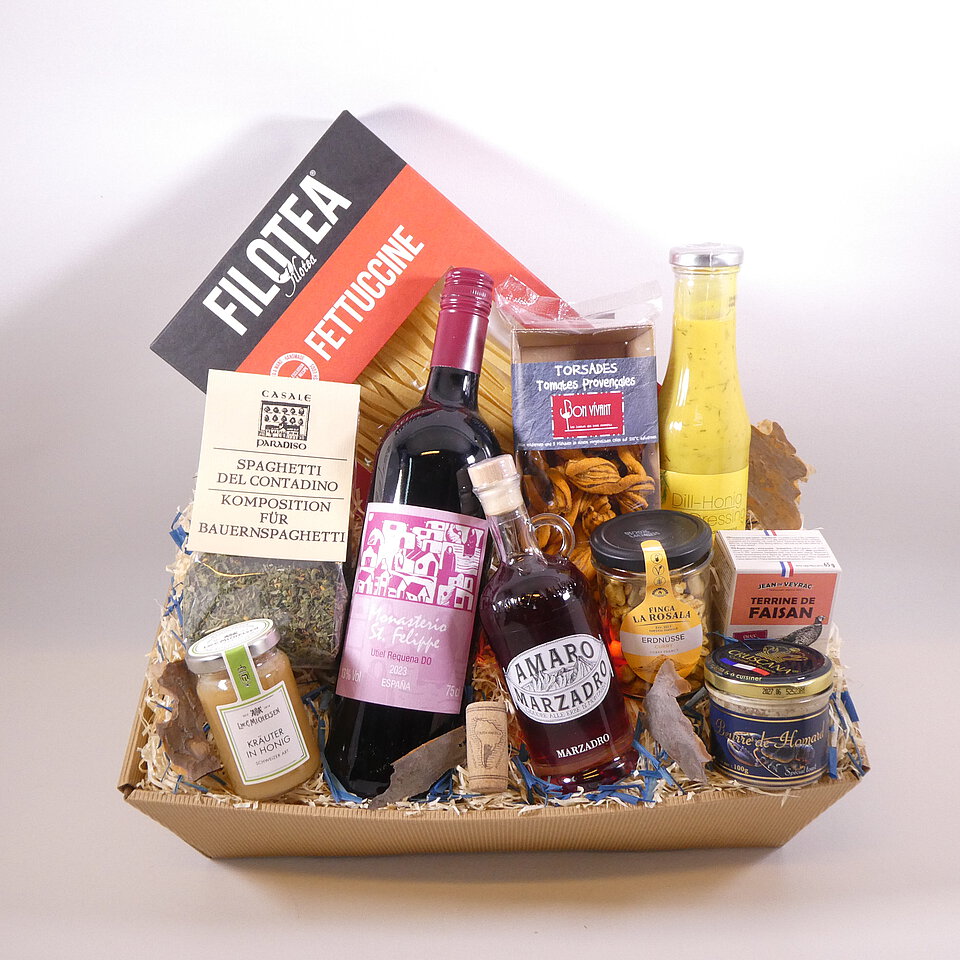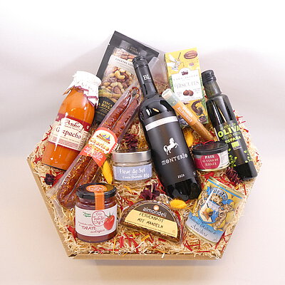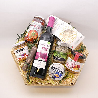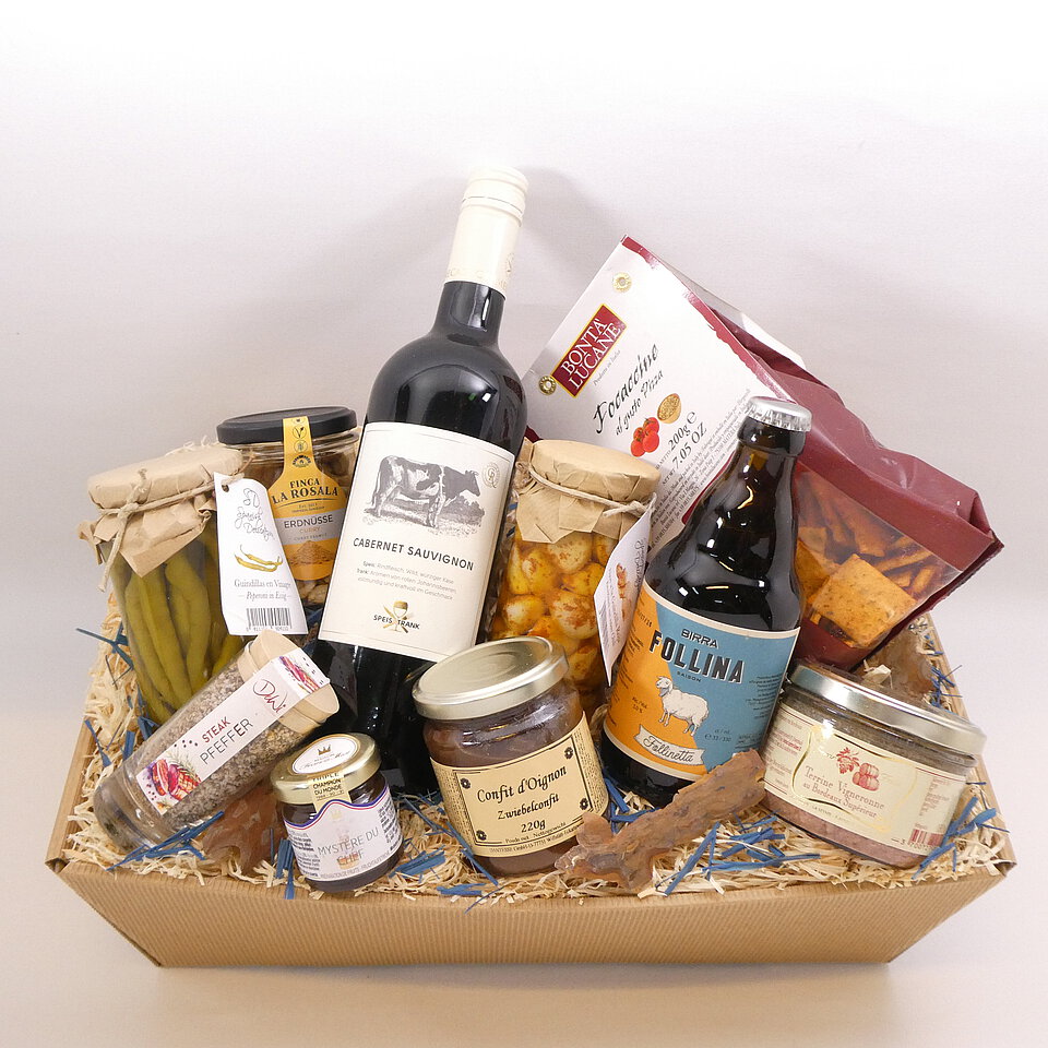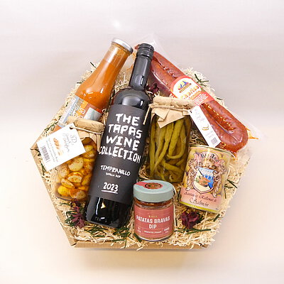 GeschenkIdee "Tapas & Wein" – im Präsentkorb mit Folie verpackt