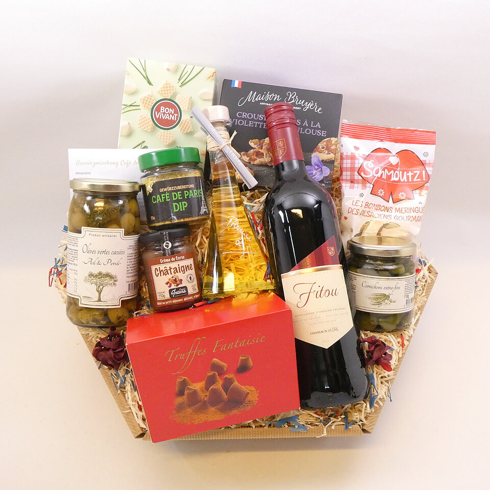 GeschenkIdee "Großer Franzose" – im Präsentkorb mit Folie verpackt