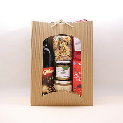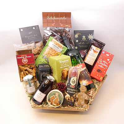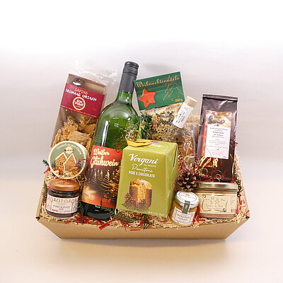 GeschenkIdee "Weihnachts-Schlemmerei" – im Präsentkorb mit Folie verpackt