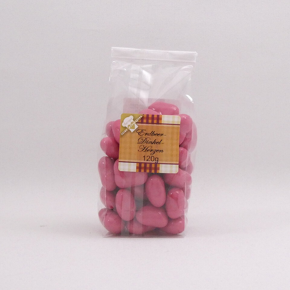Außergewöhnlich sind diese Erdbeer-Dinkel-Herzen, mit einem Kern auf Dinkelbasis, dragiert mit weißer Schokolade, mit Erdbeer- und Magermilch-Joghurtpulver verfeinert. Überzogen mit französischer Zuckerdecke.