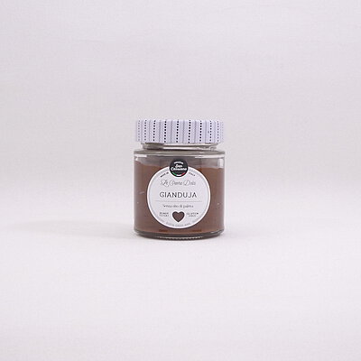 Creme mit Kakao, Haselnüssen & knusprig gehackten Tonda Gentile Trilobata Haselnüssen. Die Haselnuss- und Kakaocreme mit Gianduja entstand 1806 im Piemont, als Folge der napoleonischen Blockade auf Kakaoexporte, bei der die piemontesischen Konditoren den Kakao mit lokalen Haselnüssen "streckten". Ideal als Aufstrich auf Brot oder Keksen. Die Giandujacreme kann auch , mit Schlagsahne gemischt, als feine "Ganache" in Pralinen, Torten oder als Cupcake-Topping eingesetzt werden.