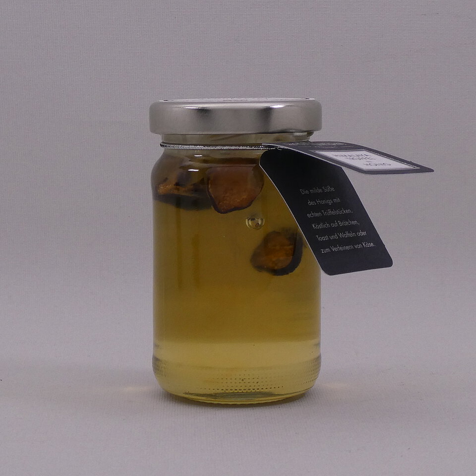 Feinster Honig mit echten Trüffelstückchen. Da der Honig sehr mild schmeckt, kommt das typische Aroma der Trüffel besonders ausgeprägt zur Geltung. Eine perfekte Kombination die nicht nur fürs Brötchen geeignet ist. Auch für die kreative Küche kann dieser Honig eingesetzt werden.