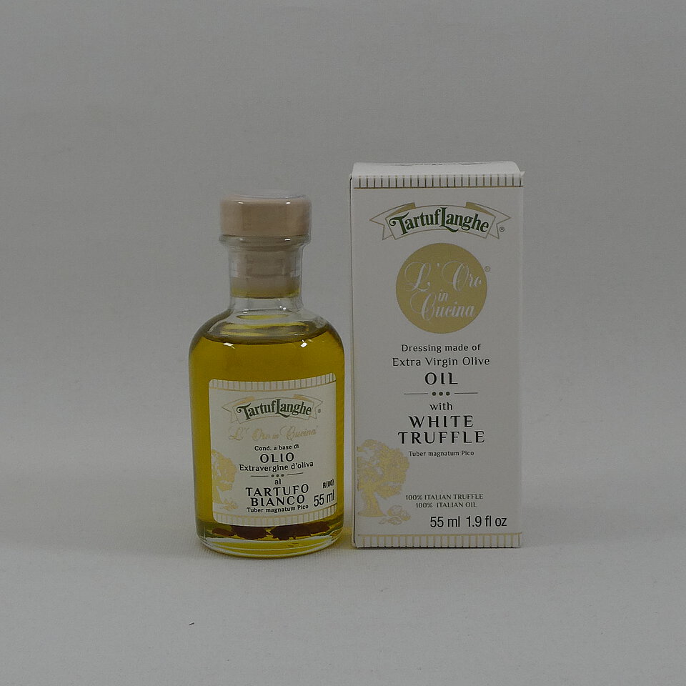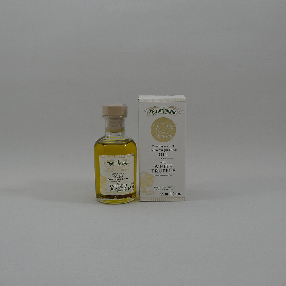 Olivenöl extra vergine, aromatisiert mit dem Aroma des weißen Trüffel. Gut zu Carpaccio, Tatar, Fleisch, Fisch, Käse und Salat.