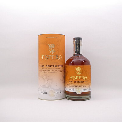 Espero Dos Continentes ist eine neue Premium Spirituose auf Rum-Basis im Portfolio der weltweit bekannten Marke Ron Espero. Eine außergewöhnliche Spirituose, die einen dreifachen Reifeprozess durchlaufen hat. Zunächst reifte das Destillat für sechs Jahre an seinem Ursprungsort in einem Ex-Bourbon-Fass. Es folgten vier weitere Jahre Reifezeit im Solera-Verfahren, zunächst im Ex-Sherry-Fass und anschließend im Ex-Banyuls-Fass. Diese Verschmelzung der drei Kulturen, die der Karibik, Spaniens und Frankreichs - daher auch der Name Espero Dos Continentes -- schafft eine unglaubliche Harmonie von Geschmack und Aroma. Das Fazit: Eine exzellente Spirituose mit 30gr/L Zuckergehalt, geblendet aus feinsten, handverlesenen und gereiften Barbados-Rums. Erwähnungswert ist noch, dass das Etikett auf der Flasche aus Feinpapier mit Struktur- und Goldfolienprägung besteht und sich Espero Dos Continentes in einer edlen Geschenkbox präsentiert.