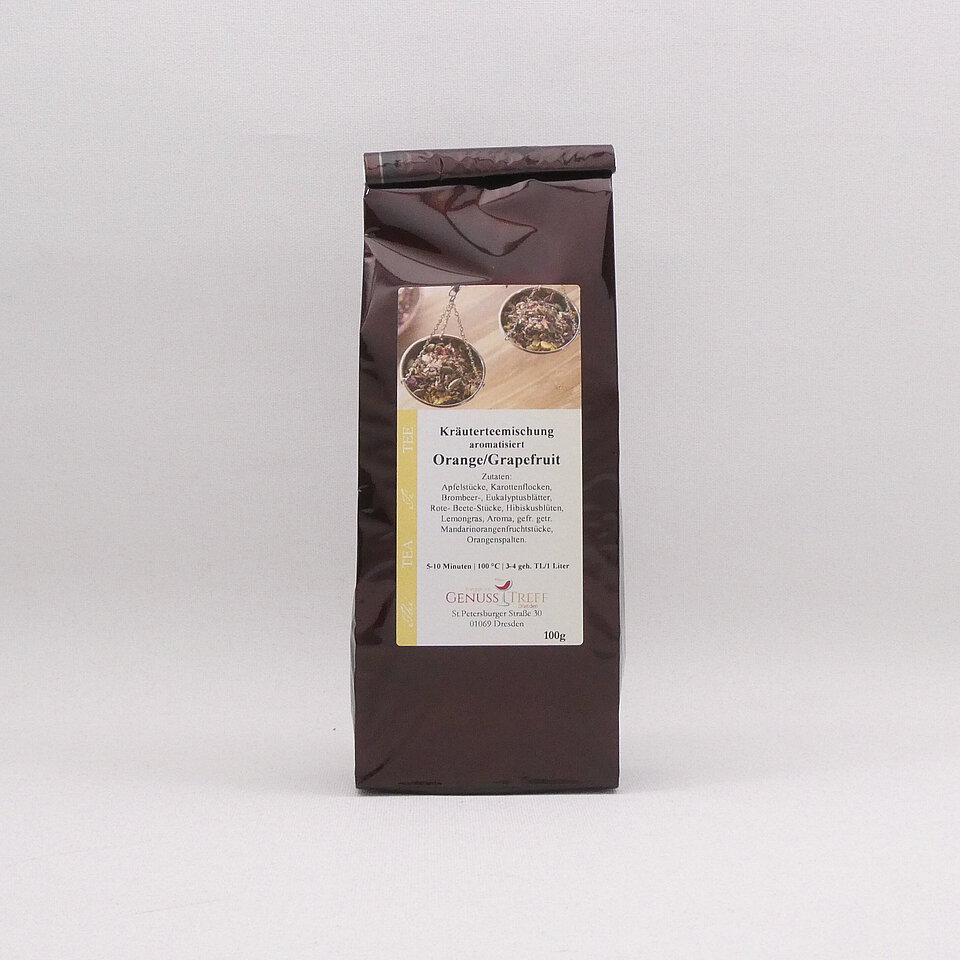 Diese milde, abgestimmte Kreation gewinnt fruchtige Süße aus Apfelstücken und Karottenflocken und einen Hauch Frische von Eukalyptusbättern, Zitronengras, Mandarinen-Orangen-Fruchtfleisch und einer Nuance Hibiskus. Rote-Bete-Stücke sorgen für die satte Tassenfarbe mit leicht erdiger Geschmacksnote. Orangenspalten mit getrocknetem Fruchtfleisch verweisen dezent auf die geschmacklichen Aromen-Noten von frischen Zitrusfrüchten. Alles in allem eine perfekte Komposition.
