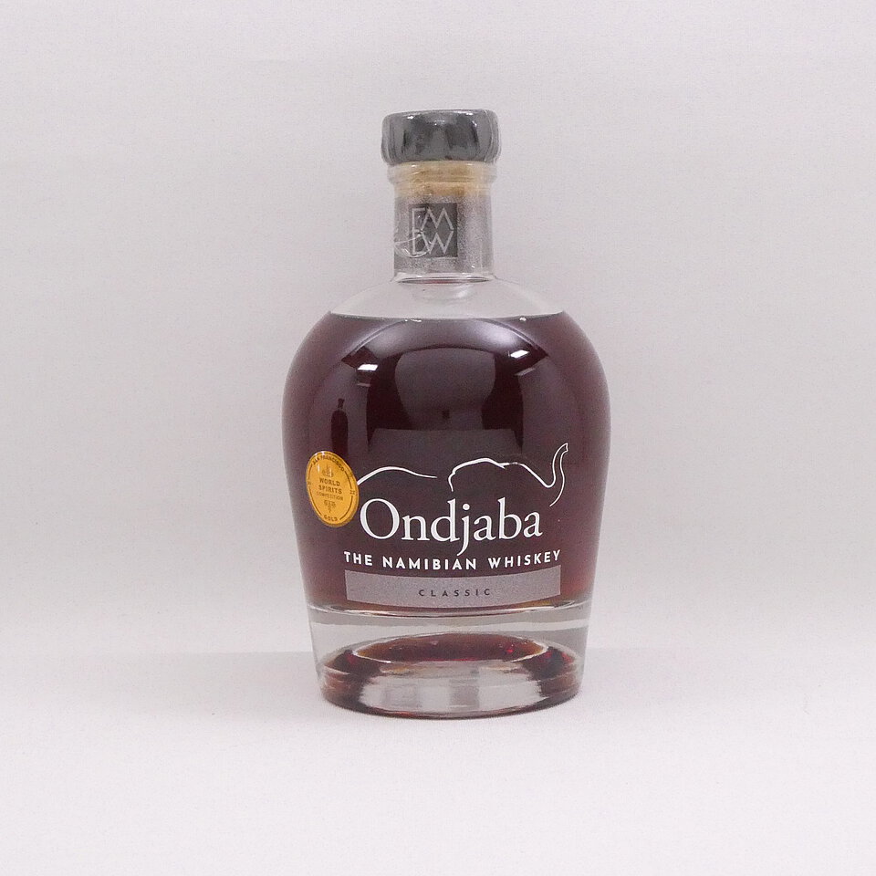Der Ondjaba Classic Namibian Triple Grain Whiskey reift intensiv in Rotwein-Barriques. Süßer Rauch, Vanille, Karamell und Wildleder bescherten ihm Gold bei der San Francisco World Spirits Competition 2022.